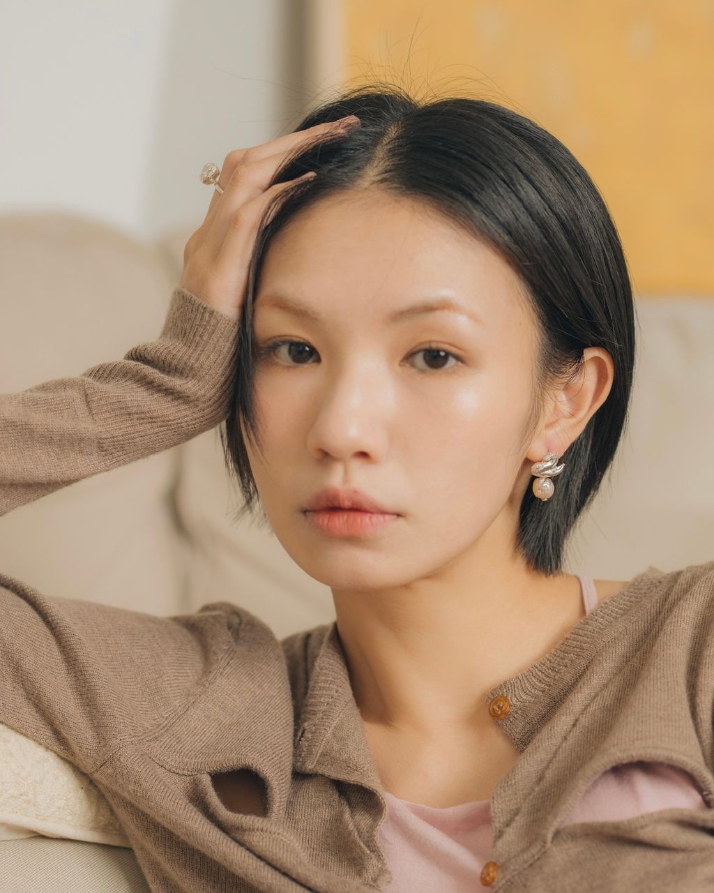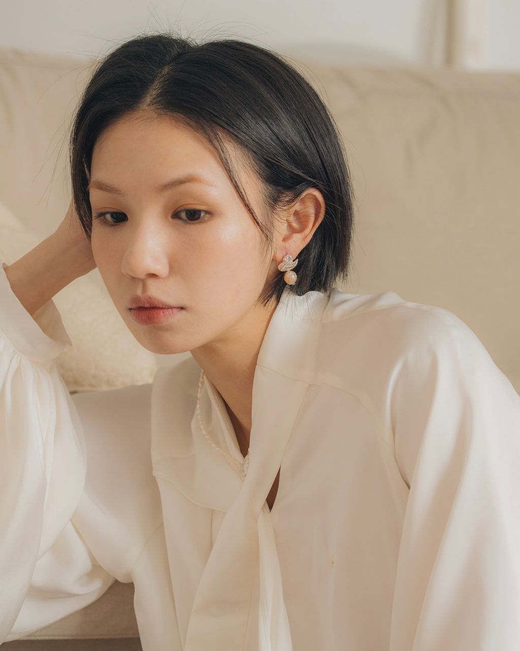 佩戴時,不規則的珍珠呼應著不規則的銀飾表面,有靜謐的古典感。