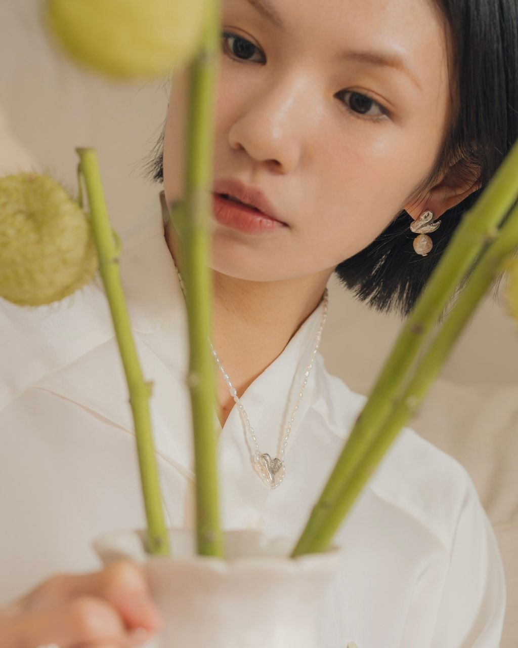 抽象天鵝銀飾搭配不規則珍珠,像水面掠過的一筆、留下閃爍的一滴。